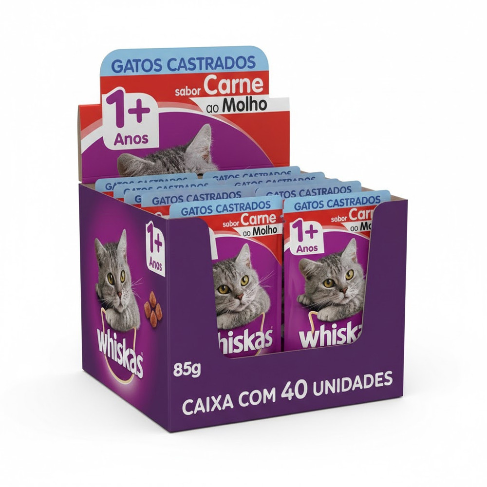 Kit Ração Úmida Whiskas Sachê Carne ao Molho para Gatos Adultos Castrados 40 Unidades