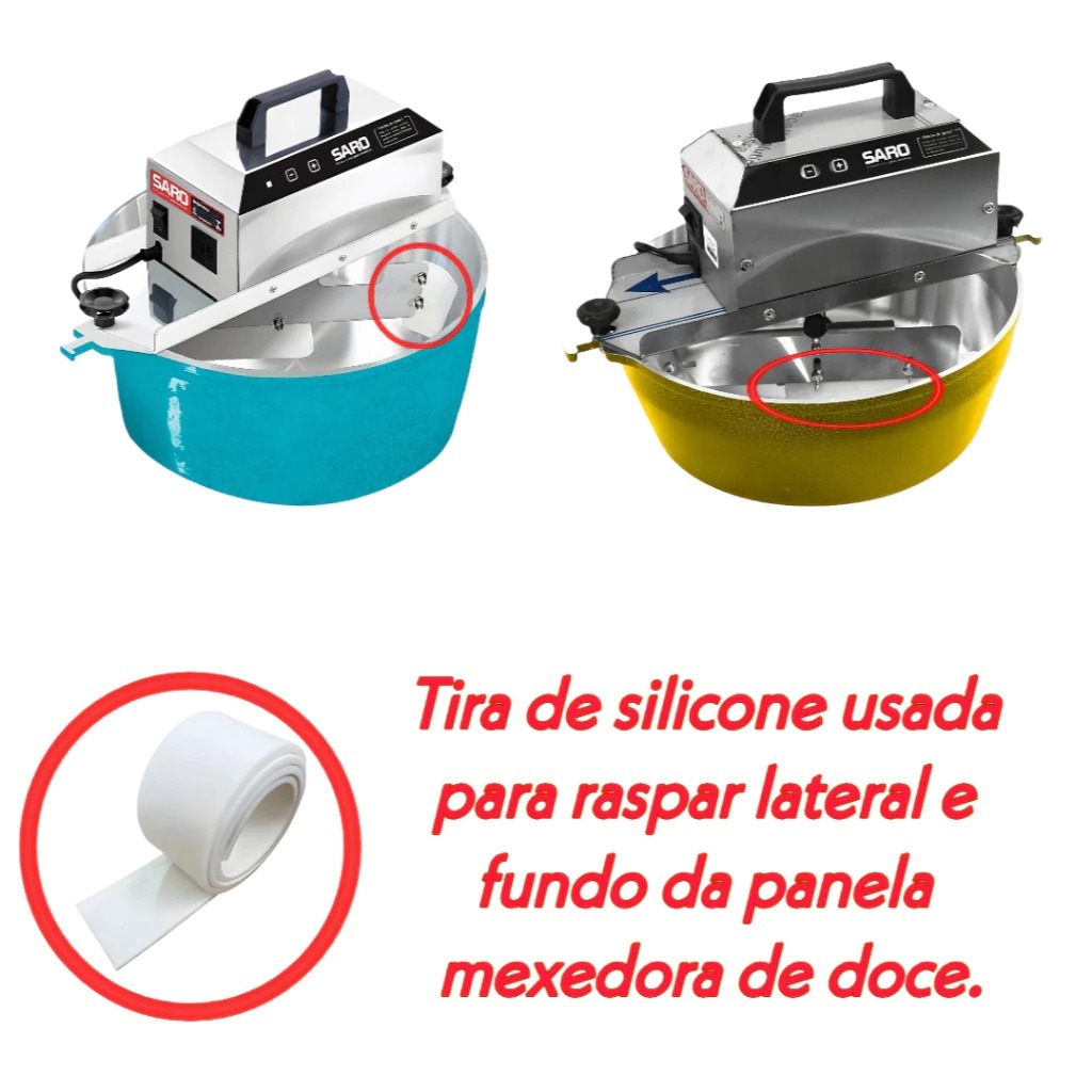 Kit 2 raspadores 1 inferior e 1 lateral de 100% Silicone Panela de Misturar Doces SARO 4 LITROS / 10 LITROS e 21 LITROS. ** ATENÇÃO AO ANUNCIO AO ESCOLHER O RASPADOR** 1 lateral 1 inferior Cor: Translucido - 5 mm de espessura x 5cm largura ( altura) pronto para uso sem precisar de furos ou cortes. Fitas de Silicone para fins alimentícios, utilizadas em Panelas Automáticas de Fazer Brigadeiros e Recheios de qualquer tamanho ou marca, conforme a sua necessidade. Silicone sustenta altas temperaturas, tem grande vantagem por suportar até 300°C