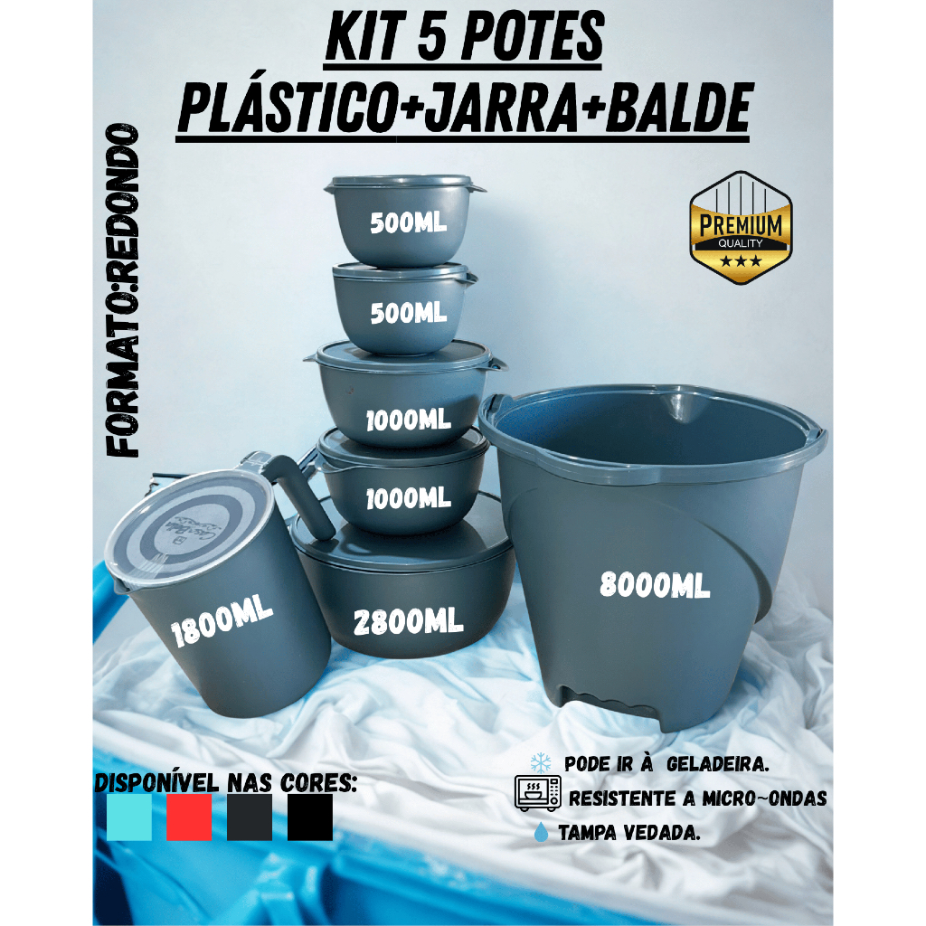 | Kit Redondo Premium 5 Potes Herméticos Plástico + Jarra 1,8L + Bald... este produto | R$ 28,68 | 28% | 4.8/5 | — |
