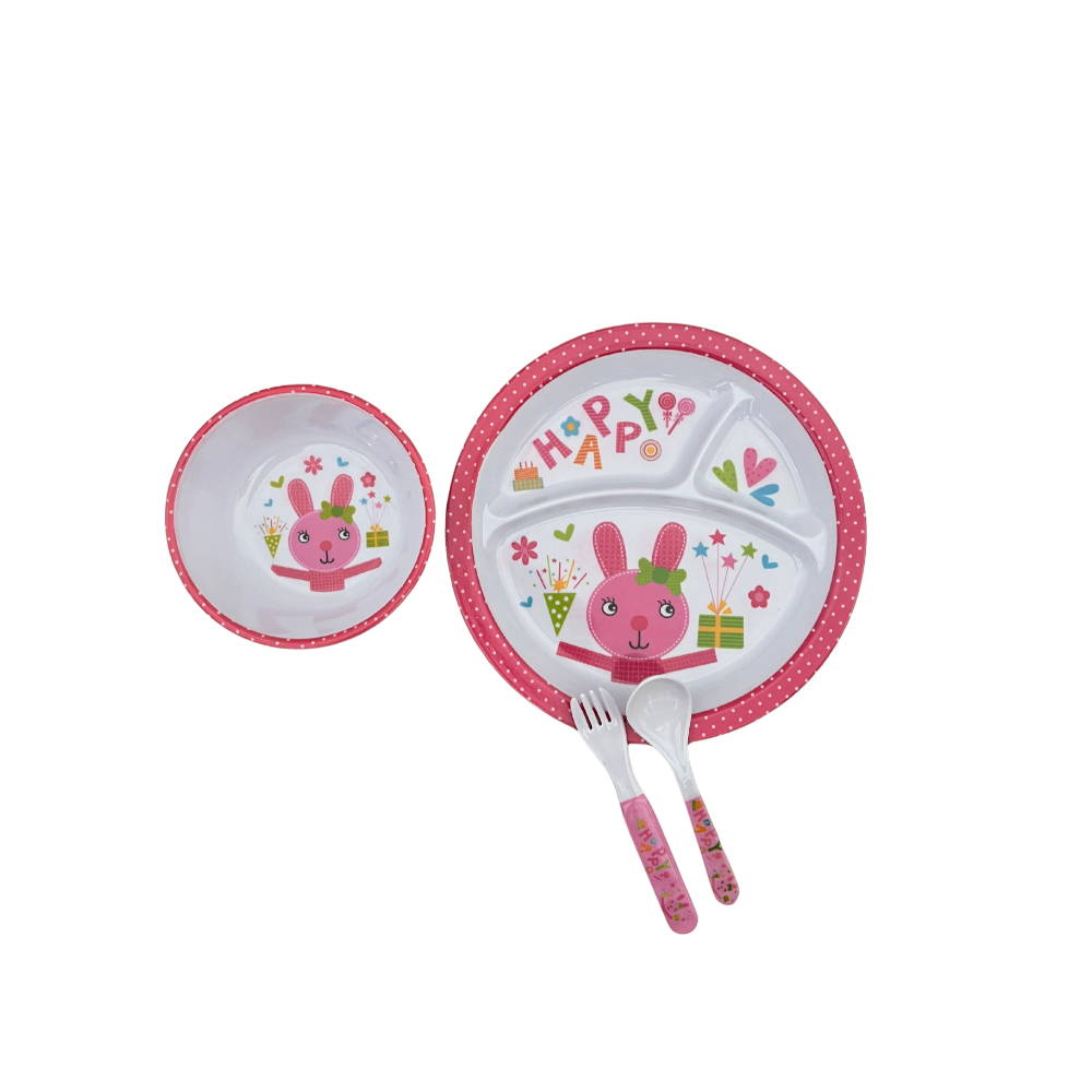 Prático, decorativo, elegante. Características Gerais: Material; plástico; Medidas Prato: 20cm Talheres: 14cm Tigela: 5cm profundidade, 12cm de largura 01 Colher; 01 Garfinho; 01 Tigela; 01 Pratinho com divisórias de alimentos; Fácil de limpar; Desenhos e cores vibrantes;