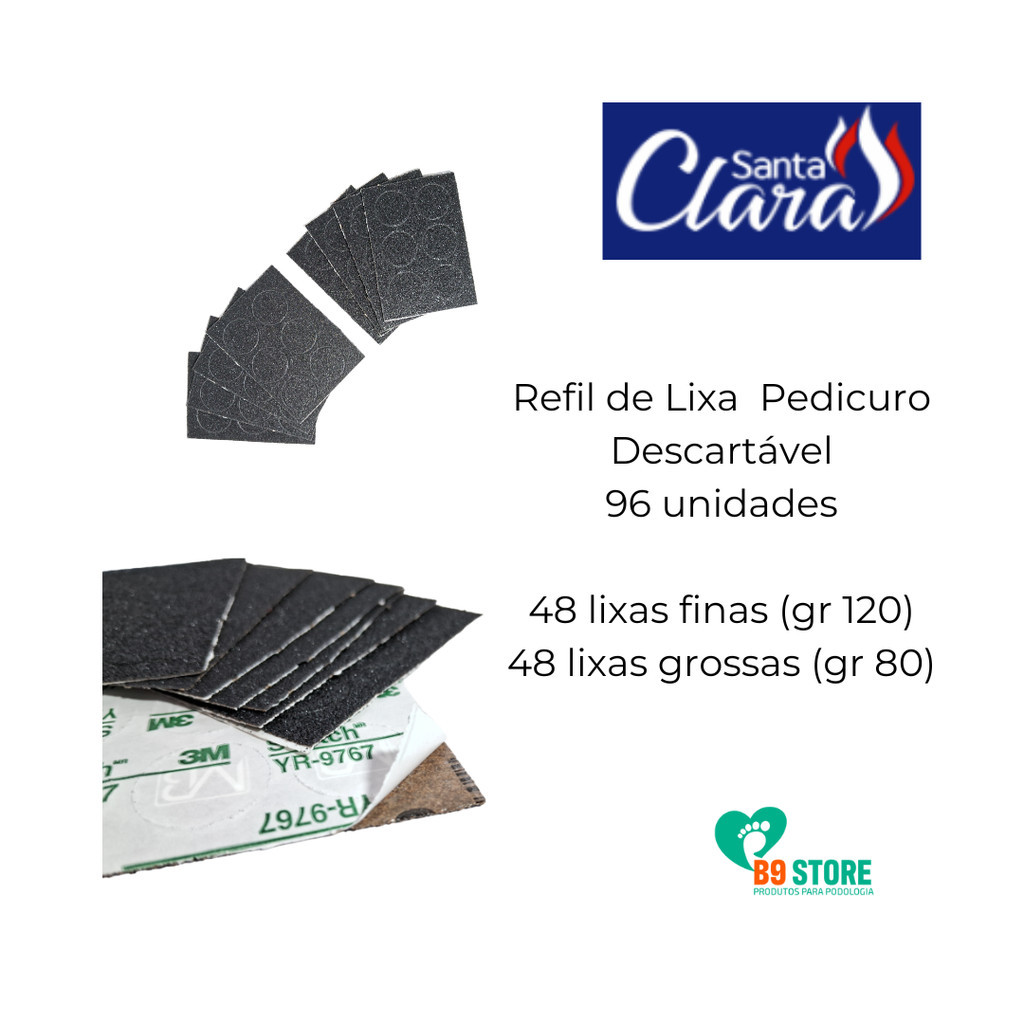 Kit Refil de lixa pedicuro c/ 96 unidades Santa Clara Este kit possui 48 lixas grossas (gramatura 80) e 48 lixas finas (gramatura 120). Vem aclopado em base plastica. Circunferencia de 2,5. Ideal para aparelho compacto e profissional da Mega Bell. Produto não perecível. Não tem a base somente a lixa adesiva. Composição: cola e lixa
