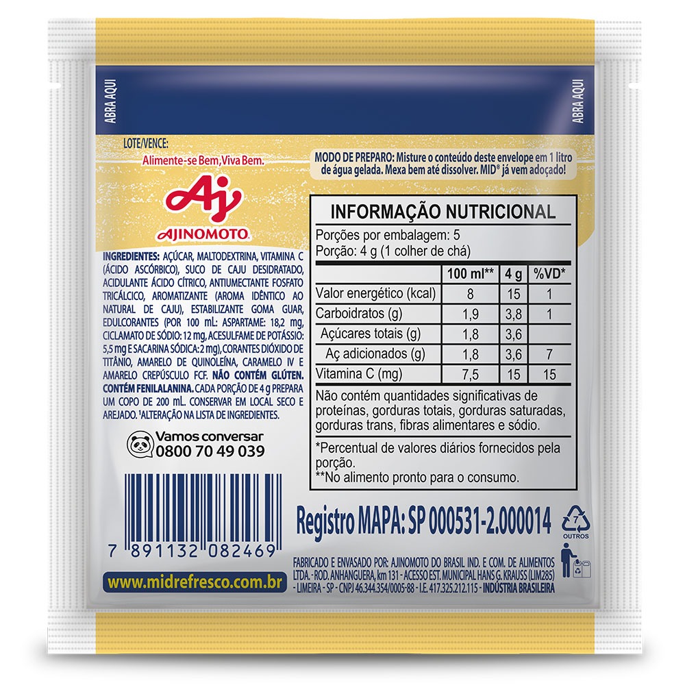 Kit Refresco em Pó MID® Sabor Caju Com 15 Unidades de 20g