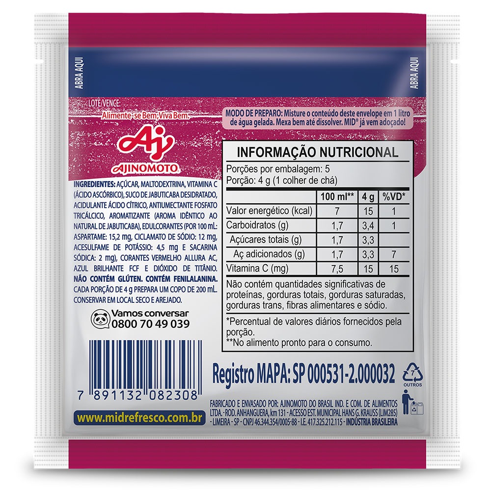 Kit Refresco em Pó MID® Sabor Jabuticaba – 15 Unidades de 20g O Kit MID® Jabuticaba traz toda a praticidade e o sabor marcante da fruta em refrescos fáceis de preparar Com um gostinho doce na medida certa e fonte de vitamina C o MID® é perfeito para quem busca uma bebida saborosa econômica e ideal para compartilhar com toda a família Com o sabor único da jabuticaba o refresco dissolve com facilidade e rende bem sendo excelente para o dia a dia festas reuniões ou para manter sempre à mão no armário Benefícios do MID® Jabuticaba Sabor autêntico de jabuticaba Adoçado na medida certa Fonte de vitamina C Fácil de preparar basta adicionar água Rende muito e é ideal para toda a família Perfeito para consumo diário ou ocasiões especiais Onde usar Refeições do dia a dia Lanches em família Festas churrascos e encontros Para levar em viagens ou deixar sempre disponível em casa Composição do kit 15 unidades de REFRESCO EM PÓ MID® SABOR JABUTICABA 20g Conteúdo REFRESCO EM PÓ MID® SABOR JABUTICABA 20g Refresque seus dias com mais sabor praticidade e aquele toque especial MID® que todo mundo ama