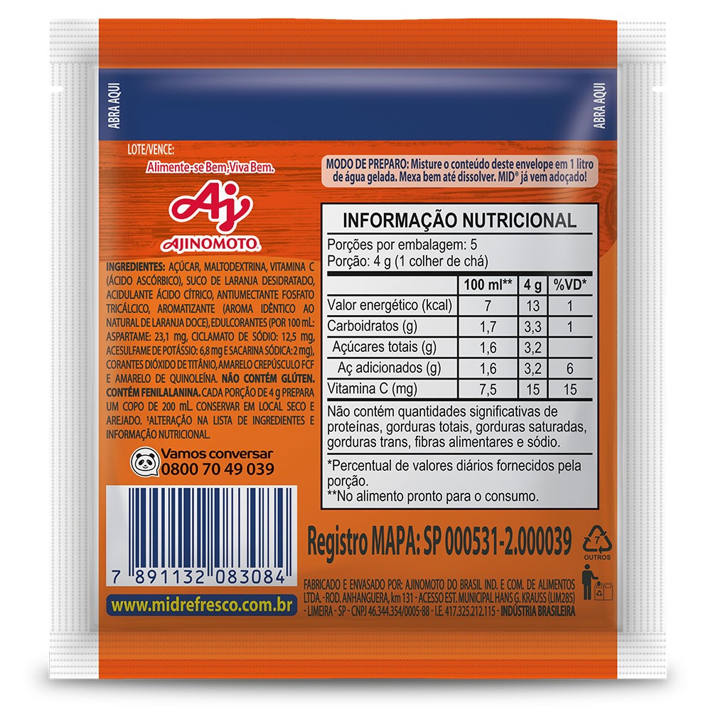 Kit Refresco em Pó MID® Sabor Laranja Doce Com 15 Unidades de 20g