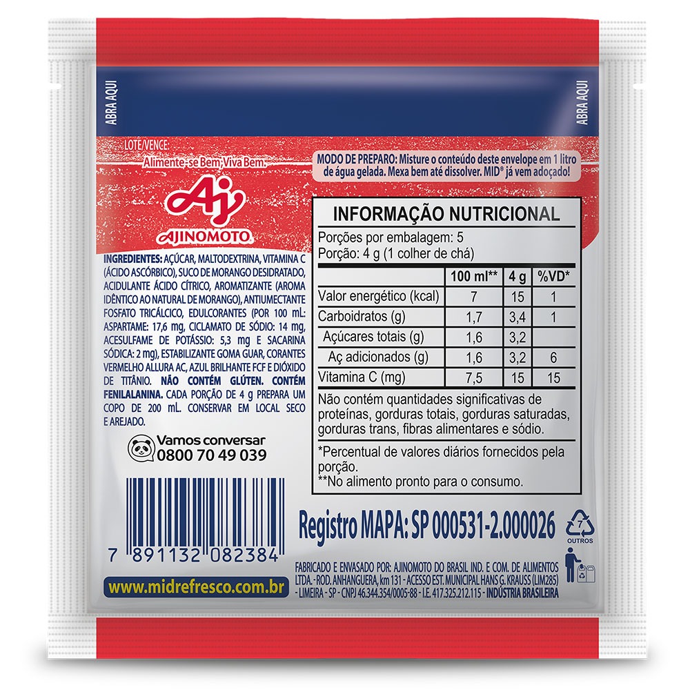Kit Refresco em Pó MID® Sabor Morango Com 15 Unidades de 20g