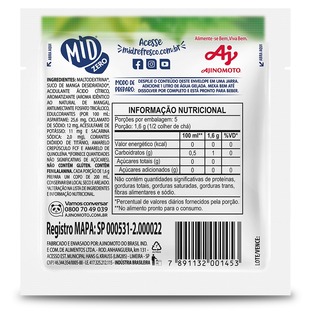 Kit Refresco em Pó MID ZERO® Sabor Manga Com 15 Unidades de 8g