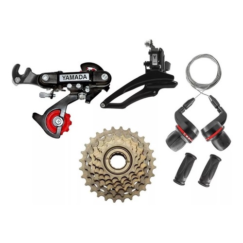Par de Câmbios de Transmissão para Bicicleta de 18 Marchas. Compatíveis com quadros de aço ou alumínio. Câmbio Traseiro 6v: Com Gancheira Marca: Yamada Cor: Preto Câmbio Dianteiro 3v: Puxa por Baixo (Abraçadeira 28,6mm) Marca: Yamada Cor: Preto Catraca : 6v Marca: Wg Sports Cor: Marrom Alavancas: Grip Shift Marca: Yamada Cor: Preto Produto Original