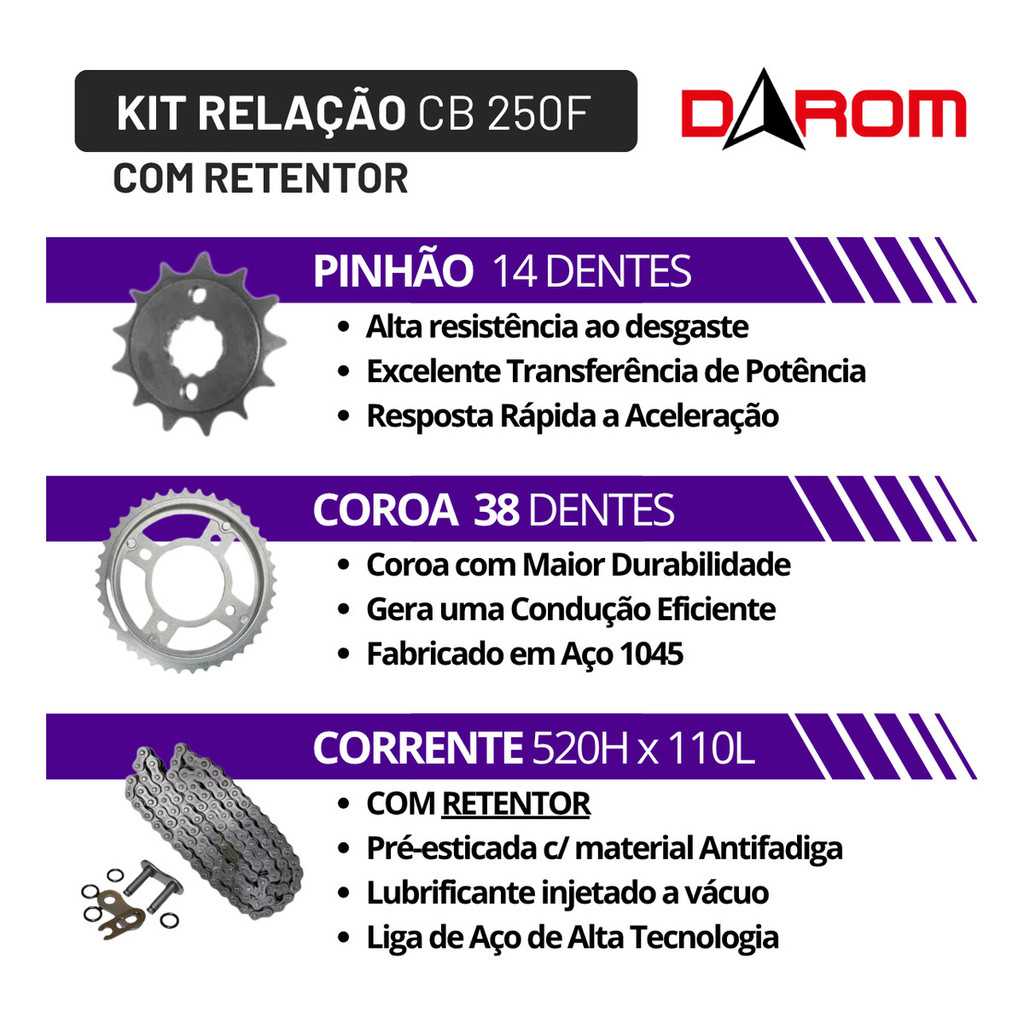 KIT TRANSMISSAO COM RETENTOR CB 300F 2023-2025 (520HX110LX38TX14T) O kit de transmissão é um dos principais responsáveis pelo bom funcionamento da moto, garantindo força, desempenho e segurança na pilotagem. Pensando nisso, oferecemos um produto de alta qualidade, desenvolvido dentro dos padrões originais para proporcionar encaixe perfeito e máxima durabilidade. Substitui o original sem adaptações, garantindo encaixe perfeito, durabilidade prolongada e transmissão suave. COMPATIBILIDADE: HONDA CB 300F TWISTER 2023 HONDA CB 300F TWISTER 2024 HONDA CB 300F TWISTER 2025 FICHA TÉCNICA: Material da Coroa: Aço 1045; Material do Pinhão: Aço 1045; Quantidade de dentes da coroa: 38; Quantidade de dentes do pinhão: 14; Comprimento da corrente: 520HO x 110L; Quantidade de ligações da corrente: 110. MARCA: DAROM CONTEÚDO DA EMBALAGEM: 01 Corrente COM RETENTOR; 01 Coroa; 01 Pinhão. OBS: Recomendamos mão de obra especializada ---------------------------------- - Envio no máximo em 24 horas úteis. - Produto 100% original. - Devolução sem custo para o cliente (dentro do prazo de 7 dias ou em caso de garantia).