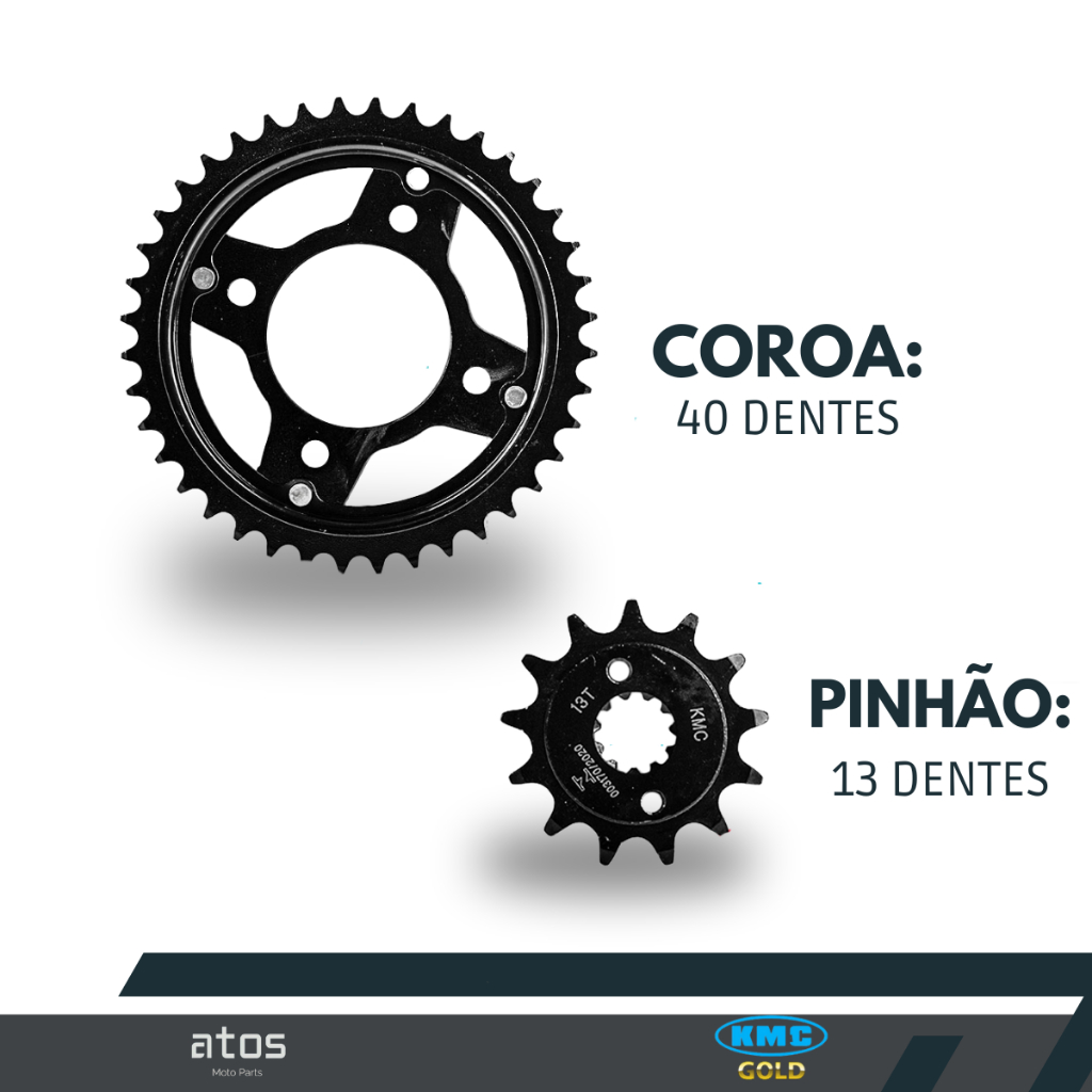 KIT CONTÉM: 1 - COROA 40 DENTES AÇO 1045 1 - PINHÃO: 13 DENTES AÇO 1045 1 - CORRENTE DE TRANSMISSÃO COM RETENTOR: 520UO-110L - Kit relação transmissão premium KMC Gold. - Compatível CB TWISTER 250 - Compatível do ano 2016 2017 2018 2019 2020 2021 2022 (medidas originais) - Com retentor - Feita com aço 1045 muito mais resistente • Recomendamos que o produto seja instalado por um profissional especializado. Muito obrigado pela preferência!
