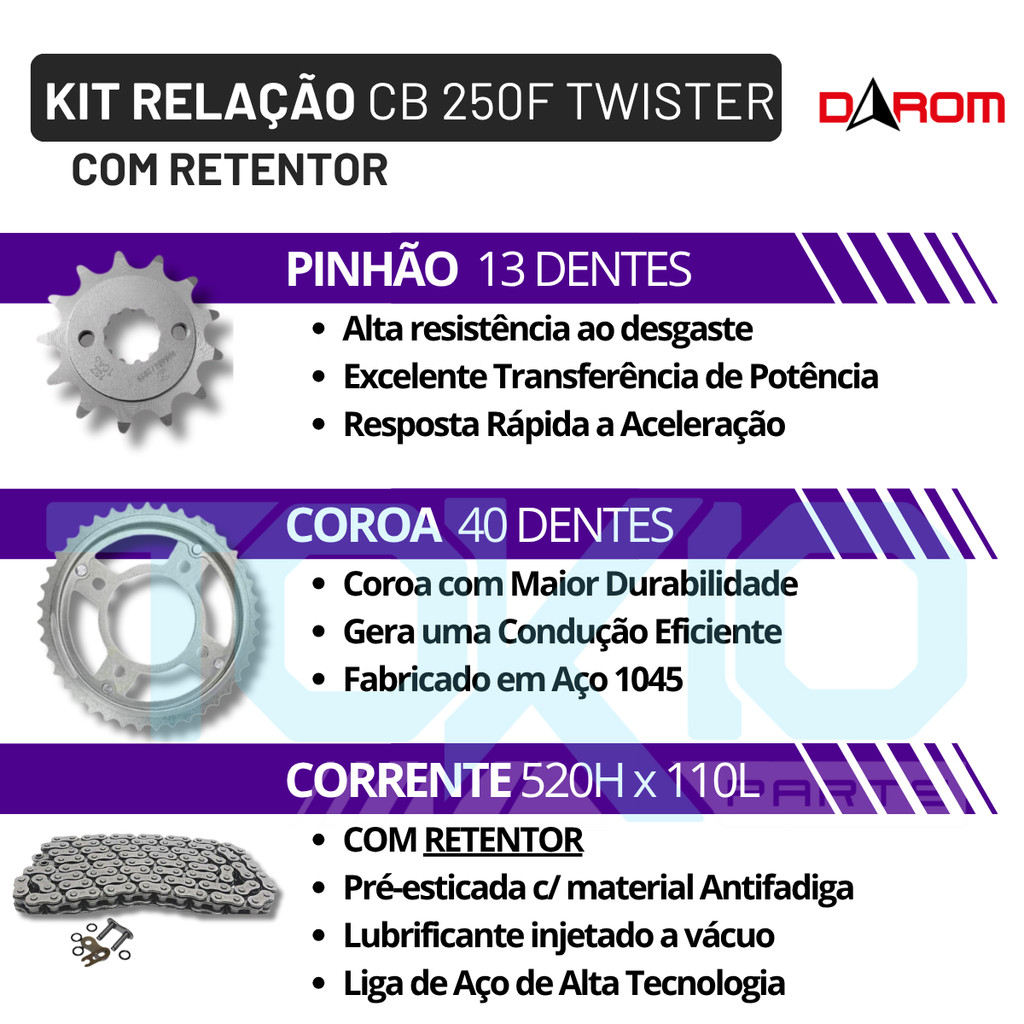 KIT TRANSMISSÃO COM RETENTOR CB 250F TWISTER 2016/2022 (520HX110LX40TX13T) Substitui o original sem adaptações, garantindo encaixe perfeito, durabilidade prolongada e transmissão suave. O kit de transmissão é composto por três peças (coroa, pinhão e corrente), sendo responsável por transportar, de maneira eficiente, a potência do motor para a roda traseira da motocicleta. COMPATIBILIDADE: HONDA CB 250F TWISTER 2016 HONDA CB 250F TWISTER 2017 HONDA CB 250F TWISTER 2018 HONDA CB 250F TWISTER 2019 HONDA CB 250F TWISTER 2020 HONDA CB 250F TWISTER 2021 HONDA CB 250F TWISTER 2022 FICHA TÉCNICA: Material da Coroa: Aço 1045; Material do Pinhão: Aço 1045; Quantidade de dentes da coroa: 40; Quantidade de dentes do pinhão: 13; Comprimento da corrente: 520 cm; Quantidade de ligações da corrente: 110. CONTEÚDO DA EMBALAGEM: 01 Corrente; 01 Coroa; 01 Pinhão. Fabricado com matéria-prima de alta qualidade; Produto testado e aprovado pelos engenheiros e mecânicos; Matéria prima de alta qualidade o que permite longa vida útil ao produto; Rigoroso controle de qualidade, com alta resistência e máxima durabilidade; OBS: Recomendamos mão de obra especializada ---------------------------------- - Envio no máximo em 24 horas úteis. - Produto 100% original. - Devolução sem custo para o cliente (dentro do prazo de 7 dias ou em caso de garantia).