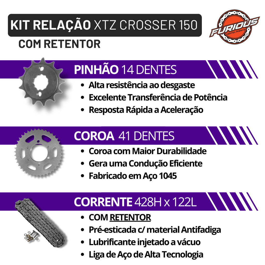 KIT TRANSMISSAO COM RETENTOR XTZ CROSSER 150 2014/ (428HX122LX41TX14T) Substitui o original sem adaptações, garantindo encaixe perfeito, durabilidade prolongada e transmissão suave. O kit de transmissão é composto por três peças (coroa, pinhão e corrente), sendo responsável por transportar, de maneira eficiente, a potência do motor para a roda traseira da motocicleta. COMPATIBILIDADE: YAMAHA XTZ CROSSER 150 2014 YAMAHA XTZ CROSSER 150 2015 YAMAHA XTZ CROSSER 150 2016 YAMAHA XTZ CROSSER 150 2017 YAMAHA XTZ CROSSER 150 2018 YAMAHA XTZ CROSSER 150 2019 YAMAHA XTZ CROSSER 150 2020 YAMAHA XTZ CROSSER 150 2021 YAMAHA XTZ CROSSER 150 2022 YAMAHA XTZ CROSSER 150 2023 YAMAHA XTZ CROSSER 150 2024 FICHA TÉCNICA: Material da Coroa: Aço 1045; Material do Pinhão: Aço 1045; Quantidade de dentes da coroa: 41; Quantidade de dentes do pinhão: 14; Comprimento da corrente: 428 cm; Quantidade de ligações da corrente: 122. CONTEÚDO DA EMBALAGEM: 01 Corrente; 01 Coroa; 01 Pinhão. Fabricado com matéria-prima de alta qualidade; Produto testado e aprovado pelos engenheiros e mecânicos; Matéria prima de alta qualidade o que permite longa vida útil ao produto; Rigoroso controle de qualidade, com alta resistência e máxima durabilidade; OBS: Recomendamos mão de obra especializada ---------------------------------- - Envio no máximo em 24 horas úteis. - Produto 100% original. - Devolução sem custo para o cliente (dentro do prazo de 7 dias ou em caso de garantia).