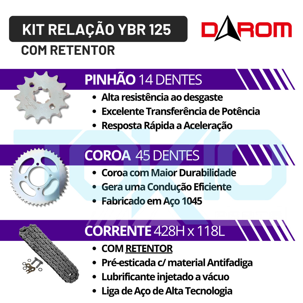 KIT TRANSMISSAO COM RETENTOR YBR 125 2003/2015 (428HX118LX45TX14T) Substitui o original sem adaptações, garantindo encaixe perfeito, durabilidade prolongada e transmissão suave. O kit de transmissão é composto por três peças (coroa, pinhão e corrente), sendo responsável por transportar, de maneira eficiente, a potência do motor para a roda traseira da motocicleta. COMPATIBILIDADE: YAMAHA YBR 125 2003 YAMAHA YBR 125 2004 YAMAHA YBR 125 2005 YAMAHA YBR 125 2006 YAMAHA YBR 125 2007 YAMAHA YBR 125 2008 YAMAHA YBR 125 2009 YAMAHA YBR 125 2010 YAMAHA YBR 125 2011 YAMAHA YBR 125 2012 YAMAHA YBR 125 2013 YAMAHA YBR 125 2014 YAMAHA YBR 125 2015 FICHA TÉCNICA: Material da Coroa: Aço 1045; Material do Pinhão: Aço 1045; Quantidade de dentes da coroa: 45; Quantidade de dentes do pinhão: 14; Comprimento da corrente: 428 cm; Quantidade de ligações da corrente: 118. CONTEÚDO DA EMBALAGEM: 01 Corrente; 01 Coroa; 01 Pinhão. Fabricado com matéria-prima de alta qualidade; Produto testado e aprovado pelos engenheiros e mecânicos; Matéria prima de alta qualidade o que permite longa vida útil ao produto; Rigoroso controle de qualidade, com alta resistência e máxima durabilidade; OBS: Recomendamos mão de obra especializada ---------------------------------- - Envio no máximo em 24 horas úteis. - Produto 100% original. - Devolução sem custo para o cliente (dentro do prazo de 7 dias ou em caso de garantia).