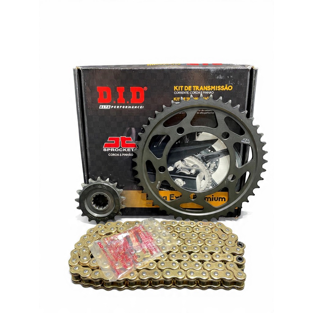 Kit de transmissão Extra Premium compatível com S1000RR 2012–2019 e S1000R 2012–2019. Produzido em parceria entre JT Sprockets e DID, oferecendo máxima durabilidade, precisão e performance. Características Principais Coroa JT – 45 dentes, aço de alta resistência Pinhão JT – 17 dentes, acabamento premium Corrente DID 520 x 120 – dourada, japonesa, com retentor tipo X Emenda ZJ (remanche/rebitar) Durabilidade superior e desempenho esportivo Ideal como upgrade de qualidade extra premium Informações adicionais Código do fabricante: 071725 EAN: 7894932006826 Garantia: 30 dias