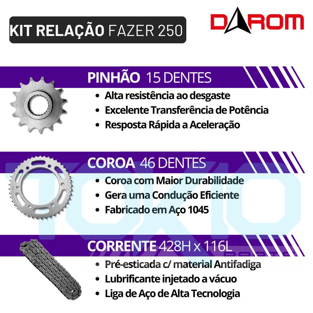 | KIT RELAÇÃO FAZER 250 2018/2024 TRANSMISSAO YAMAHA PREMIUM este produto | R$ 99,90 | 29% | 5.0/5 | 1 |