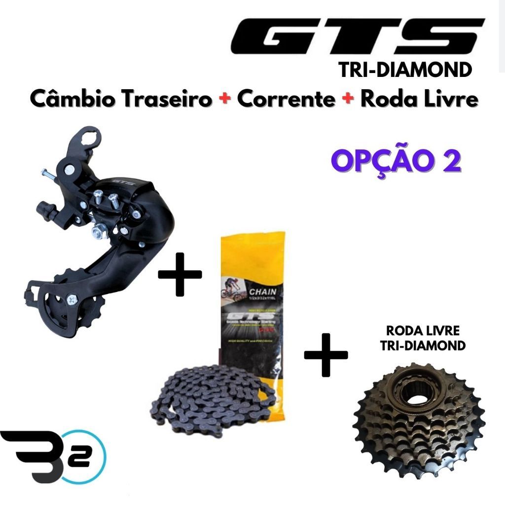 Todos os KITs são montados com componentes originais GTS e acompanham nota fiscal. Avalie qual é a melhor opção para sua necessidade e para fazer a compra basta selecionar aquele que melhor atendê-lo. Despachamos os produtos em até 24 horas, exceto para pedidos feitos de sexta-feira a domingo, pois não temos coleta da Shopee nestes dias. Kit – Opção 1 - Um Cambio Traseiro GTS ; - Um Par de Passadores de Marcha index GTS, sendo um dianteiro de 3 velocidades e um Traseiro de 7 velocidades. Acompanha os dois cabos de marcha; - Uma Roda Livre Tri-Diamond de 7 velocidades de Rosca; - Uma Corrente fina index GTS. Kit – Opção 2 - Um Cambio Traseiro GTS; - Uma Corrente fina index GTS; - Uma Roda Livre Tri-Diamond de 7 velocidades de Rosca. Kit – Opção 3 - Um Cambio Traseiro GTS; - Uma Corrente fina index GTS. Kit – Opção 4 - Um Par de Passadores de Marcha index GTS, sendo um dianteiro de 3 velocidades e um Traseiro de 7 velocidades. Acompanha os dois cabos de marcha; - Um Cambio Traseiro GTS. Kit – Opção 5 - Um Cambio Traseiro GTS ; - Um Cambio Dianteiro GTS; - Uma Roda LivreTri-Diamond de 7 velocidades de Rosca; - Uma Corrente fina index GTS. ____________________________________________________________________________________________________________________________________________ *****Especificação Técnica Individual de cada componente do Kit: *** Roda Livre 7 Velocidades Tri-Diamond - Marca: Tri-Diamond - (Produto importado de qualidade equivalente à superior a GTS) - Sistema de Encaixe: Rosca; - Compatível com 7 velocidades; - Número de Coroas/Engrenagens: 7; - Relação de Dentes de cada Coroa: 13/15/17/19/21/24/28; - Material: Fabricada em aço carbono de alta qualidade. *** Cambio Traseito GTS - Marca: GTS - Compatível com 7/8/9 velocidades e Coroas/Engrenagens de até 34 dentes; - Material: Aço Carbono e polietileno (plástico). *** Corrente Fina GTS - Marca: GTS - Modelo: G81i; - Compatível com 6/7/8 Velocidades; - Medida: 1/2"x3/32" - 116 Elos / Links; - Configuração Relação: 3x8v, 2x8v 1x8v / 3x7v, 2x7v, 1x7v / 3x6v, 2x6v, 1x6v; - Acompanha PINO de conexão; - Material: Aço Liga. Acabamento em Níquel especial de alta durabilidade e Tratamento DHA (chromiun carbid treatment) que garante maior durabilidade; *** Passador de Marchas e Manete de Freio Rapid Fire Gts 21 Velocidades - Marca: GTS; - Aplicação: Todos os modelos de bicicletas com 21 marchas index; - Compatível com freios V-Brake e freio a disco; - Possui display para visualização das marchas; - Material: Manetes e corpo em alumínio e gatilho/trocador da marcha em aço carbono; - Medida: Abraçadeira 22,2mm; - Cor: Preto; Itens inclusos: - 1 Par (direita e esquerda) de passador/trocador de marchas Rapid-Fire, 21v, GTS; - 2 Cabos de Câmbio.