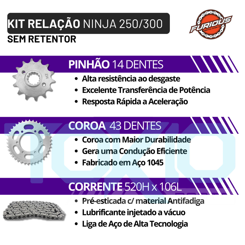 KIT RELAÇÃO NINJA 250 300 2008 A 2018 KAWASAKI TRANSMISSÃO