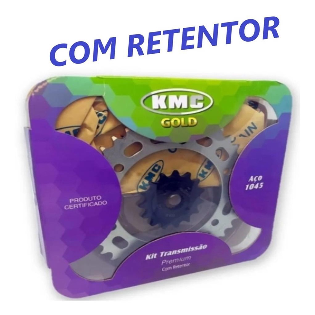 KIT RELACAO COMPLETO NXR BROS 160 / XRE 190 (COROA/PINHAO E CORRENTE COM RETENTOR) - OFERTA LANCAMENTO!!! NOVO NA CAIXA - ORIGINAL KMC PRINCIPAIS APLICACOES: MOTOS: HONDA NXR BROS 160 ANO: 2015 A 2022 MOTOS: HONDA XRE 190 ANO: 2015 A 2022 *Aco 1045 *Corrente 428HX128L (COM RETENTOR) *48 dentes da coroa *16 dentes do pinhao Funcao da Coroa e do Pinhao: A Coroa e o Pinhao juntamente com a corrente sao conhecidos como kit relacao, e sao fundamentais para uma pilotagem segura, sendo responsaveis por transmitir o movimento da saida da transmissao ate a roda traseira. Como detectar problemas? Verifique se ha desgastes nos dentes da coroa e do pinhao. Ao trocar verifique tambem: o ideal e realizar a troca do kit inteiro (coroa, pinhao e corrente com retentor) para garantir a durabilidade do conjunto, ruidos e folga na transmissao de forca. Diferenciais: Produzida em aco 1045 Endurecimento termico para aumentar a resistencia e durabilidade Numero de dentes conforme padrao original Dentes tratados termicamente ****Recomendamos que os produtos sejam instalados por profissionais especializados***