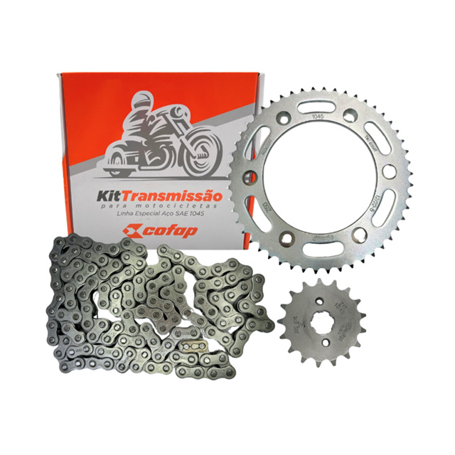 Kit Relação (Transmissão). Especificações Técnicas: - Corrente 428H X 130L; - 50 dentes da coroa; - 17 dentes do pinhão. Conteúdo da Embalagem: - O kit contém corrente, coroa e pinhão. O produto é novo? Sim, todos os produtos são novos e originais de fábrica. O kit relação é fundamental para uma pilotagem segura, sendo responsável por transmitir o movimento da saída da transmissão até a roda traseira! A Cofap é referência em custo-benefício e qualidade, tudo feito em aço 1045, garantindo grande durabilidade a longo prazo.