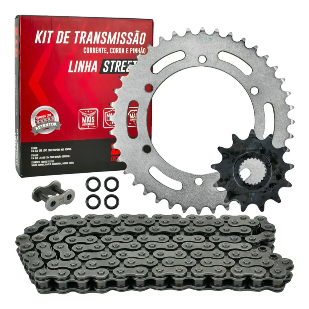 Kit Relação Transmissão Yamaha Lander / Tenere 250 DID com Retentor - Linha Street Código do fabricante: 074512 EAN: 789493200946 Kit de transmissão DID linha Street, desenvolvido para oferecer durabilidade, resistência e performance superior para sua moto. Aplicação Yamaha XTZ 250 Lander – 2009 em diante Yamaha XTZ 250 Tenere – 2010 em diante Especificações Técnicas Corrente DID 520VD-106ZB com retentor (106 elos) – emenda de arrebitar Coroa: 40 dentes – aço 1045 com têmpera nos dentes Pinhão: 13 dentes – aço 1045 de alta resistência Kit completo: corrente com retentor + coroa + pinhão – todos originais DID Dentes em perfil “U” – transmissão mais silenciosa e durável Acabamento anticorrosivo em coroas e pinhões Observações Importantes Para instalação correta é necessário utilizar ferramenta de arrebitar emenda de corrente. A instalação deve ser feita por um profissional qualificado. Não nos responsabilizamos por má instalação, podendo resultar na perda da garantia do fabricante. Este kit garante maior vida útil, melhor desempenho e segurança para sua moto.