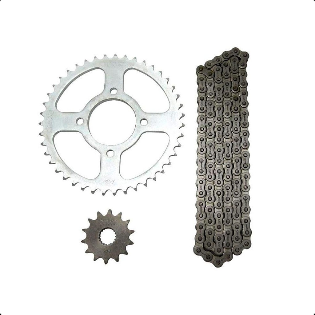 Kit relação (Transmissão). Desenvolvidos com a mais alta qualidade e tratamento térmico especial para aumentar a resistência e durabilidade nas áreas de maior uso e impacto. Especificações Técnicas: - Aço 1045; - Peso 1,860kg; - Corrente 428HX108 sem O'ring; - 39 dentes da coroa; - 15 dentes do pinhão. Conteúdo da Embalagem: - O kit contém corrente, coroa e pinhão.