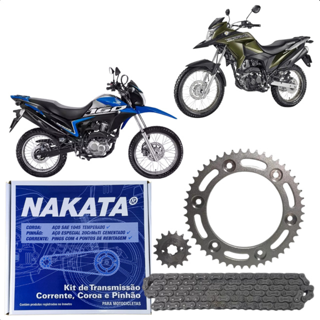 Sobre nós: A Mega autopeças é uma loja especializada em peças automotivas nacionais e importadas. Com mais de 35 anos de experiência no ramo automotivo procuramos sempre oferecer um serviço de qualidade e eficiência para os nossos clientes. Estamos sempre a disposição para quaisquer dúvidas! Este anúncio contém os seguinte produto: 01 (um) Kit Relação; Código do produto: TM1090; Observação do produto: Coroa 48 Dentes - Pinhão 16 Dentes; Aplicação dos Veículos: Veículo: NXR 160 Bros; Ano de fabricação: 2015, 2016, 2017, 2018, 2019, 2020, 2021; Veículo: XRE190; Ano de fabricação: 2015, 2016, 2017, 2018, 2019, 2020, 2021; Sobre o Fabricante: A Nakata é uma empresa brasileira bem conhecida no setor de autopeças, especialmente na fabricação de componentes para sistemas de suspensão e direção. A empresa se destaca pela produção de peças como pivôs, buchas, amortecedores, e outros componentes essenciais para a manutenção e o bom funcionamento dos veículos. Para que Serve o Produto: O Kit de Relação TM10190 da marca Nakata é um conjunto composto por peças essenciais para o sistema de transmissão de veículos. Ele geralmente inclui: Corrente de transmissão (corrente de moto) Relação de engrenagens (coroa e pinhão) Esses componentes são essenciais para garantir que o sistema de transmissão do veículo (geralmente motos) funcione de forma eficiente, proporcionando a transferência de potência do motor para a roda traseira, permitindo que a moto se mova. A troca e manutenção da relação são importantes para manter o desempenho do veículo e garantir uma boa durabilidade das peças. As boas práticas de uso incluem: Verificação regular: Inspecionar periodicamente o estado da corrente e das engrenagens. Lubrificação: Aplicar graxa ou óleo adequado para garantir que as peças se movam suavemente e evitem o desgaste precoce. Substituição no tempo adequado: Trocar as peças conforme a recomendação do fabricante ou ao perceber sinais de desgaste, como ruídos excessivos ou dificuldade na mudança de marcha.