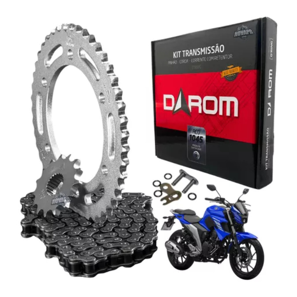 MARCA DAROM Kit Tração Relação Transmissão YAMAHA FAZER 250/ FZ25 2018 a 2024 Características: - Fabricado em Aço 1045, para maior resistência e durabilidade podendo chegar a 30.000 KM se dado a manutenção correta. COMPONENTES: • 1 Corrente Transmissão 428H x 136L com retentor • 1 Coroa 46 dentes; • 1 Pinhão 15 dentes;