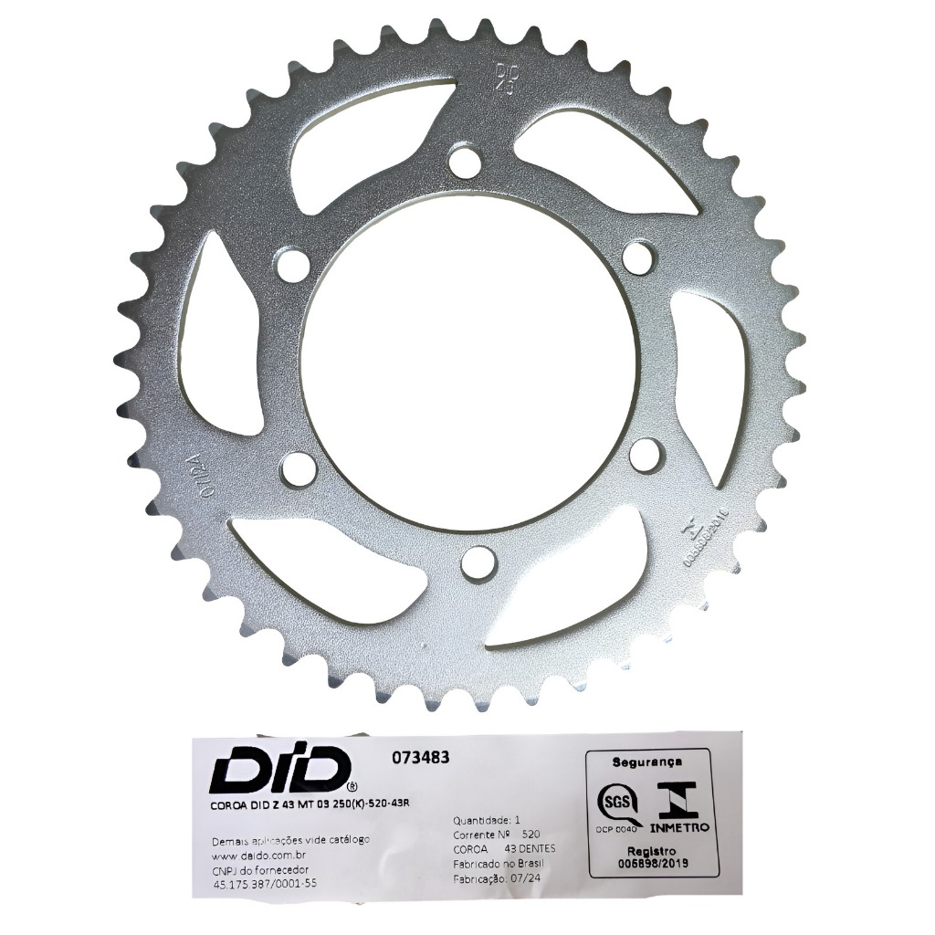 ENVIAREMOS: -1 COROA 43 DENTES -1 PINHÃO 14 DENTES -1 CORRENTE COM RETENTOR 520VD-112ZB --------------------------------------------- Aplicação: -MT-03 2017 À 2023 -R3 2015 À 2021 ------------------------------------------- INFORMAÇÕES: -COR: PRETO E PRATA -MARCA: DID -COD FABRICANTE: 69150 -CORRENTE COM RETENTOR -EMENDA DE REBITAR -COROA EM AÇO 1045 COM TÊMPERA NOS DENTES -PINHÃO EM AÇO LIGADO COM CEMENTAÇÃO ESPECIAL ------------------------------------ !!! DESPACHAREMOS SEU PRODUTO DENTRO DE 24 HORAS !!! Atenção -O prazo de entrega do produto é ESTIPULADO PELOS TRANSPORTADORA -As compras que precisam de confirmação de pagamento (por meio de boletos) só serão postadas após a devida confirmação.