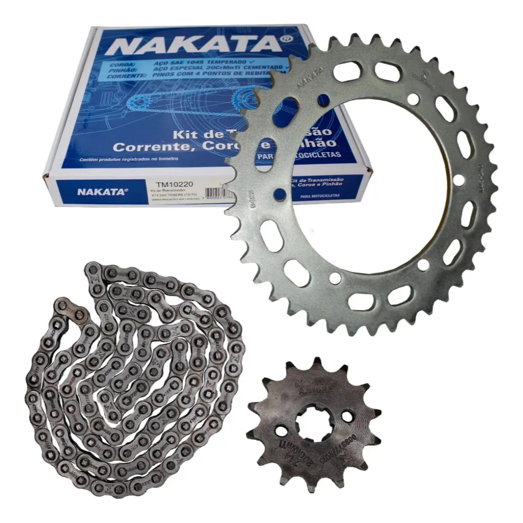PRECO REFERENTE AO KIT - COROA PINHAO E CORRENTE - ORIGINAL NAKATA - ACO 1045 PRINCIPAIS APLICACOES: MOTOS: XTZ250 LANDER ANO: 2013 ATE 2020 MOTOS: XTZ250 TENERE ANO: 2011 ATE 2019 Diferenciais Coroa e Pinhao NAKATA *Produzida em aco 1045 *Endurecimento termico para aumentar a resistencia e durabilidade *Numero de dentes conforme padrao original *Dentes tratados termicamente Diferenciais Corrente NAKATA *Funcionamento preciso e silencioso *Pinos com quatro pontos de rebitagem para maior resistencia e seguranca *Placa de espessura robusta para maior durabilidade *Bucha e rolo com tratamento termico e encaixe perfeito ****Recomendamos que os produtos sejam instalados por profissionais especializados***
