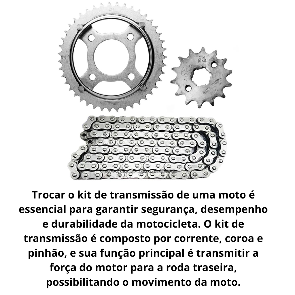 Kit Relação Transmissão Yamaha XTZ 125 (2002 a 2016) – Aço 1045 – Alta Durabilidade Produto novo e de qualidade premium, ideal para reposição da relação original da sua Yamaha XTZ 125 dos anos 2002 a 2016. Conteúdo do Kit: 1 Coroa em Aço 1045 temperado 1 Pinhão em Aço 1045 com tratamento térmico 1 Corrente de transmissão reforçada (com ou sem retentor – conforme escolha) Especificações: Material: Aço 1045 de alta resistência Excelente durabilidade mesmo em uso severo (estrada ou trilha) Encaixe perfeito e compatibilidade 100% garantida com modelos XTZ 125 Corrente com número de elos ideal para a configuração original Vantagens: Alta performance e maior vida útil do kit Reduz desgaste prematuro das peças Ideal para quem busca confiabilidade e desempenho Compatível com: Yamaha XTZ 125 de 2002 a 2016 Instalação recomendada por profissional mecânico Envio rápido e seguro Tire suas dúvidas no campo de perguntas Garanta agora o melhor custo-benefício para sua moto! Garantia do vendedor: 30 dias