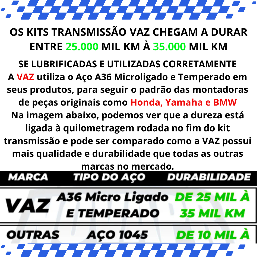Kit Relação Transmissão VAZ Xtreme BLACK com Retentor – Código Y04583X Compatível com Yamaha YZF R3 321 (2015 a 2018) e MT-03 321 (2016 em diante) O kit de relação VAZ Xtreme BLACK foi desenvolvido para quem exige o melhor em desempenho, resistência e durabilidade. Produzido com materiais de alta qualidade, com certificação INMETRO, ele garante mais eficiência na transmissão da sua Yamaha, seja para uso urbano, rodoviário ou esportivo. Aplicação Yamaha YZF R3 321 – de 2015 a 2018 2015 / 2016 / 2017 / 2018 Yamaha MT-03 321 – a partir de 2016 2016 / 2017 / 2018 / 2019 / 2020/ 2021/ 2022/ 2023/ 2024 Composição do Kit Y04583X Pinhão: 14 dentes – Aço 1045 Coroa: 43 dentes – Aço 1045 Temperado Corrente: 520HOR x 112 – Reforçada com retentor (emenda tipo clipe) Diferenciais da Linha VAZ Xtreme BLACK Corrente com retentor (O’ring), que garante menor atrito, menos desgaste e maior vida útil Componentes fabricados com aço 1045 e tempera controlada, proporcionando mais resistência à tração e impacto Certificação INMETRO que atesta qualidade e confiabilidade Desenvolvido com tecnologia de ponta e tratamento térmico avançado Benefícios para o motociclista Reduz o número de trocas e manutenções Aumenta a durabilidade da transmissão (ideal para quem roda muito) Performance mais estável e silenciosa Produto com excelente custo-benefício Especificações técnicas Kit pronto para instalação Corrente com emenda clipe Linha: VAZ Xtreme BLACK Produto novo, com garantia e nota fiscal Pronta entrega Invista em um kit de relação com tecnologia de ponta, performance comprovada e garantia de qualidade. VAZ Xtreme BLACK: mais resistência para sua moto ir além.