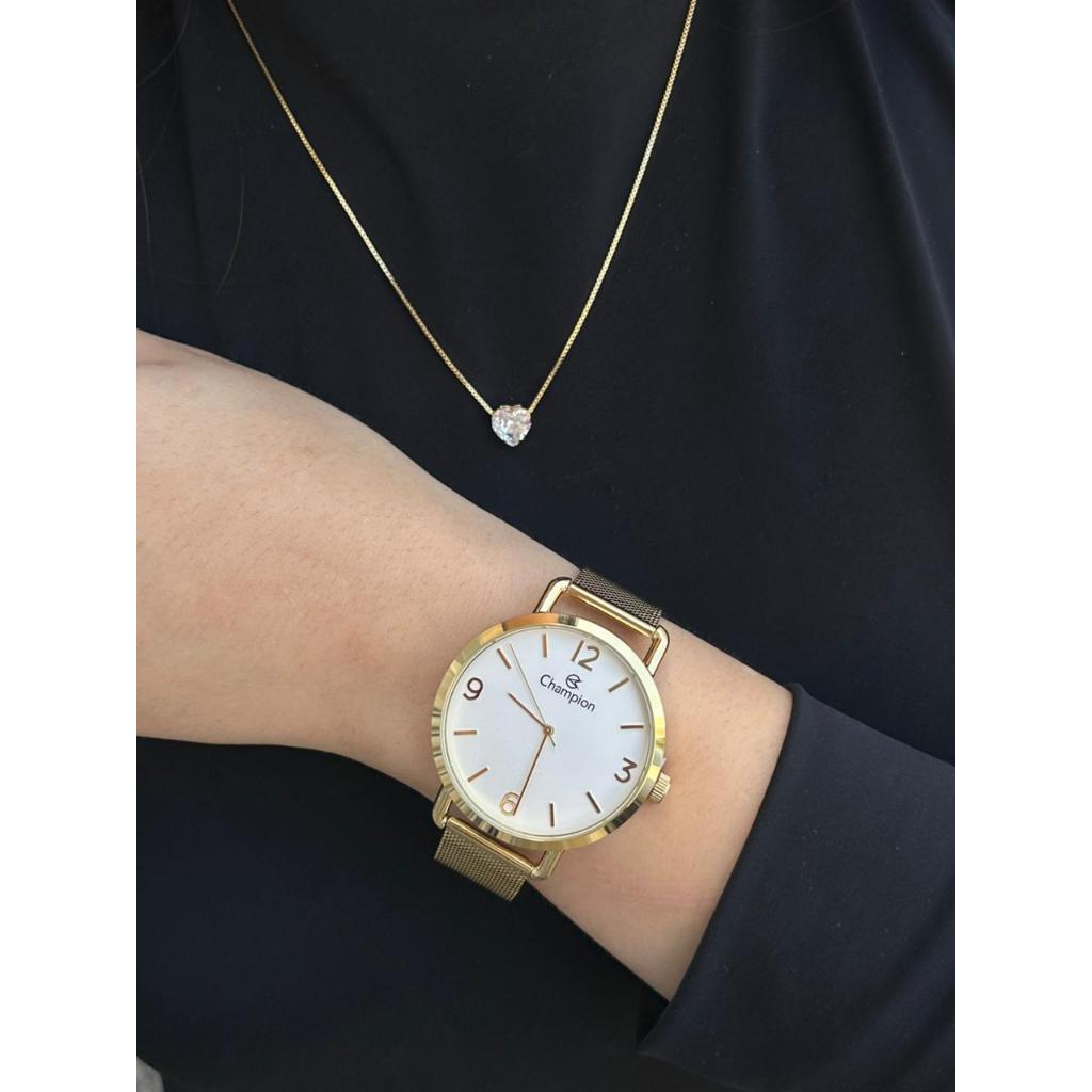 Kit Relógio Champion Feminino Analógico Pulseira Esteira Dourado Original Fundo Branco
