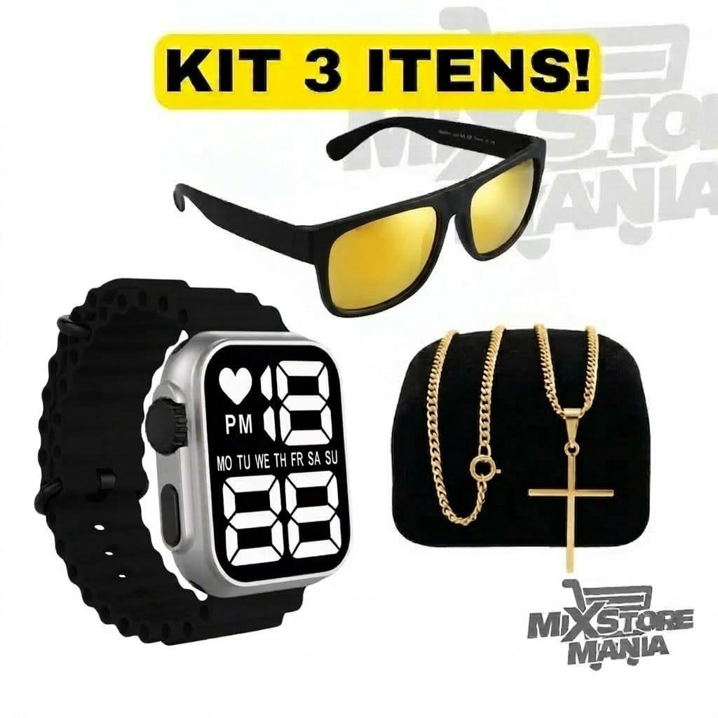 Kit Relógio Digital LED Masculino + Óculos de Sol Premium + Corrente com Pingente | Combo Esportivo Presente