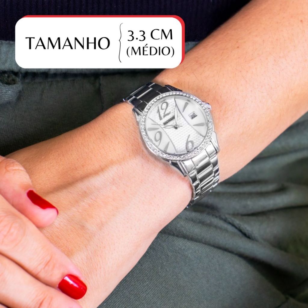 O Relógio Ana Hickmann AH28544Q combina design refinado e detalhes luxuosos para mulheres que apreciam um acessório sofisticado e atemporal. Seu acabamento em aço inoxidável prateado com mostrador elegante e cristais na moldura garantem um toque especial ao seu visual. Dimensões e Peso ✔ Diâmetro da Caixa: 3,3 cm (PEQUENO) ✔ Largura da Pulseira: 1,4 cm ✔ Espessura: 1,1 cm ✔ Circunferência Máxima: 20 cm ✔ Peso: 80 gramas Materiais de Alta Qualidade ✔ Vidro: Cristal Mineral – resistência contra riscos e impactos ✔ Caixa: Aço Inoxidável – durabilidade e brilho sofisticado ✔ Pulseira: Aço Inoxidável – ajuste confortável e design elegante ✔ Fundo: Rosca – vedação reforçada para maior segurança Recursos Especiais ✔ Resistência à água 5 ATM – suporta lavagem das mãos, chuvas e esportes leves ✔ Mecanismo Quartz – precisão e confiabilidade no funcionamento ✔ Fecho Dobrável com Botão – encaixe seguro e prático para ajuste perfeito Cores e Estilo ✔ Mostrador: Prata – discreto e sofisticado ✔ Caixa e Pulseira: Prata – brilho refinado e acabamento premium O Que Vai na Embalagem? ✔ Relógio Original Ana Hickmann AH28544Q ✔ Caixa Original Ana Hickmann ✔ Kit Colar e Brincos (Pode variar conforme o lote de produção do fabricante, sem possibilidade de escolha) ✔ Manual de Instrução em Português ✔ Certificado de Garantia (1 ano com o fabricante) ✔ Nota Fiscal – autenticidade e segurança garantidas Por que Comprar na RBM WEBSHOP? ✅ Produtos 100% originais, com nota fiscal e garantia oficial ✅ Envio imediato e seguro para todo o Brasil ✅ Atendimento de qualidade – suporte rápido para suas dúvidas Garanta já o seu! Estoque limitado! 📦 Compre agora e receba no conforto da sua casa. Aproveite essa oferta especial!
