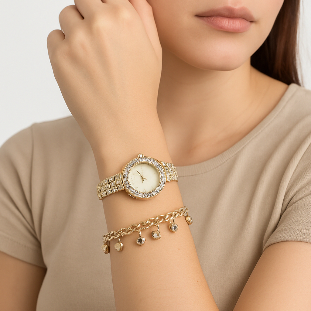 Kit Relógio Feminino Luxo com Strass Fino + Pulseira Feminina | Presente Elegante e Sofisticado para mulher