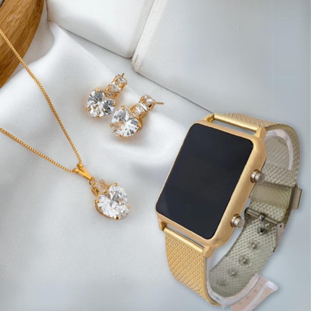 Kit Relógio Feminino Quadrado Digital Led Com Colar e Brinco