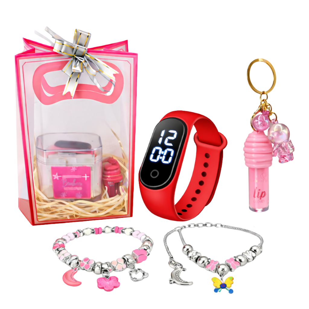 Kit Relógio Infantil Digital + Colar Pulseira Berloque + Lip Gloss c/ Chaveiro | Sacola Presente Meninas Dia das Criança