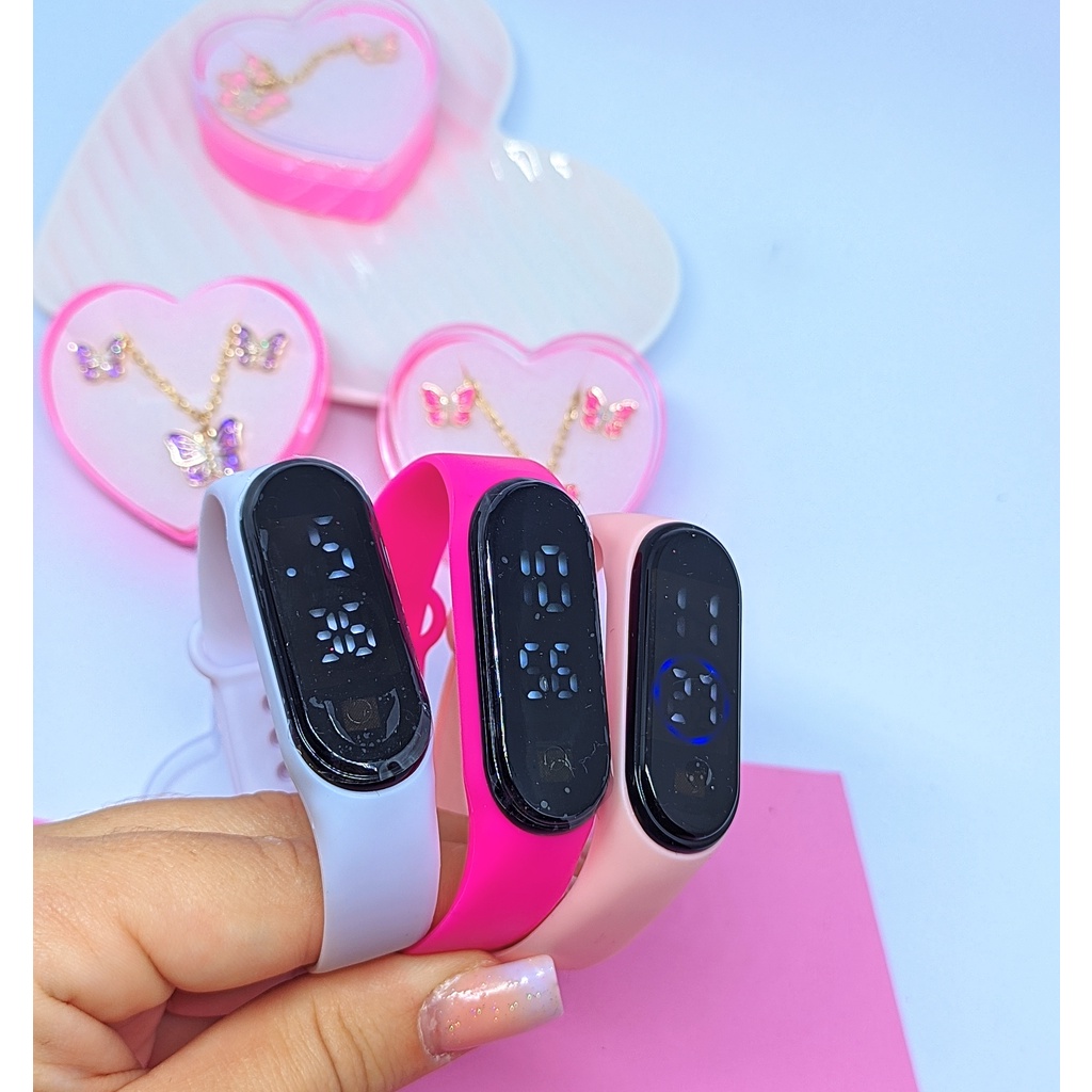 Kit Relógio Infantil Digital Led Silicone Ajustável Prova água + Conjunto Colar e Brincos Meninas Caixa Coração Moda