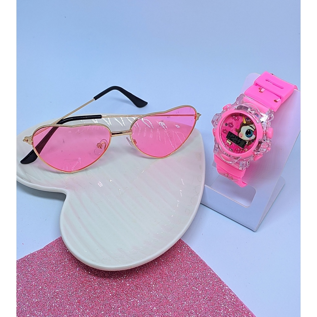 Kit Relógio Infantil Digital Pisca Luz Led Princesa Disney Meninas Barbie Frozen + Óculos de Sol Coração Aço Flexivel