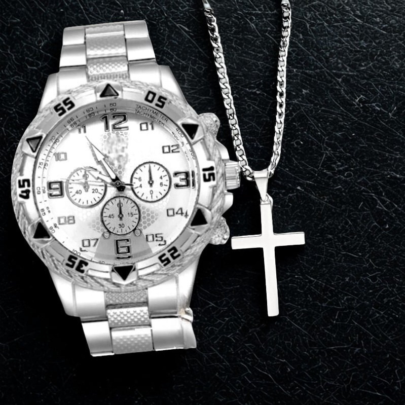 Kit Relógio Masculino Aço Inoxidável + Corrente Prata com Cruz Crucifixo