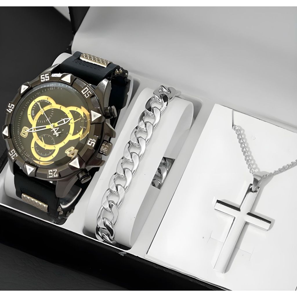 Kit Relogio Masculino Original Banhado a Ouro + Corrente Cruz + Pulseira Banhada