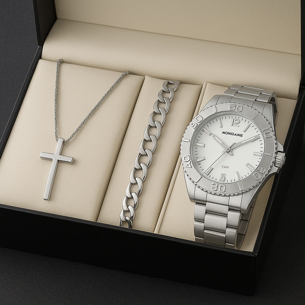 Kit Relógio Masculino Original + Corrente Cruz Banhado a Ouro 18k + Pulseira Luxo Kit acompanha: 1 Corrente 1 Relógio masculino 1 pulseira 1 Pingente cruz Temos a opção de enviar somente o relógio também* fica ao seu critério . ENVIAMOS NO MESMO DIA! OFERTA POR TEMPO LIMITADO! CONFERIMOS TODOS OS ITENS ANTES DO ENVIO PARA NÃO IR COM DEFEITO! Lindo Relógio Masculino Resistente a respingos d’água Cor muito brilhante, chama a atenção Luxuoso e estiloso Visor com vidro de alta resistência Apresentamos o kit de relógio dourado com pulseira e corrente banhada, uma verdadeira expressão de elegância e sofisticação. Este conjunto exclusivo é muito mais do que apenas acessórios; é um símbolo de status e estilo incomparáveis. Atenção a caixinha da foto da capa não acompanha o kit. Seja no escritório, em uma reunião de negócios importante ou em um evento social elegante, este kit de relógio dourado é a chave para destacar-se com elegância e confiança. Não perca a oportunidade de adicionar um toque de luxo à sua vida. Faça a escolha certa, faça parte da elite da moda com o nosso kit de relógio dourado com pulseira e corrente em banhada. Encomende agora e eleve o seu estilo a um nível superior. O produto em questão não possui uma marca específica. A marca presente foi atribuída por exigências regulatórias. Estamos comprometidos em fornecer produtos de qualidade, independentemente da marca associada. Agradecemos a sua compreensão. Além de seu design deslumbrante, o relógio oferece precisão suíça inigualável e a corrente e pulseira são feitas banhada a ouro, proporcionando durabilidade. Este kit é a escolha definitiva para aqueles que valorizam a qualidade e desejam impressionar em todas as ocasiões. Devido à grande quantidade em estoque, algumas variações podem ocorrer nos produtos. Isso é parte do charme e autenticidade de cada peça individual. Nosso compromisso é garantir a mais alta qualidade em todos os aspectos do produto, e qualquer variação não compromete sua beleza ou funcionalidade. Estamos aqui para garantir sua satisfação total, sua confiança é nossa prioridade. Imagine-se deslumbrante, com o brilho do banhado a ouro adornando seu pulso e pescoço. Este conjunto é a fusão perfeita de precisão no tempo com o glamour intemporal. Cada detalhe foi cuidadosamente trabalhado para destacar sua personalidade única.