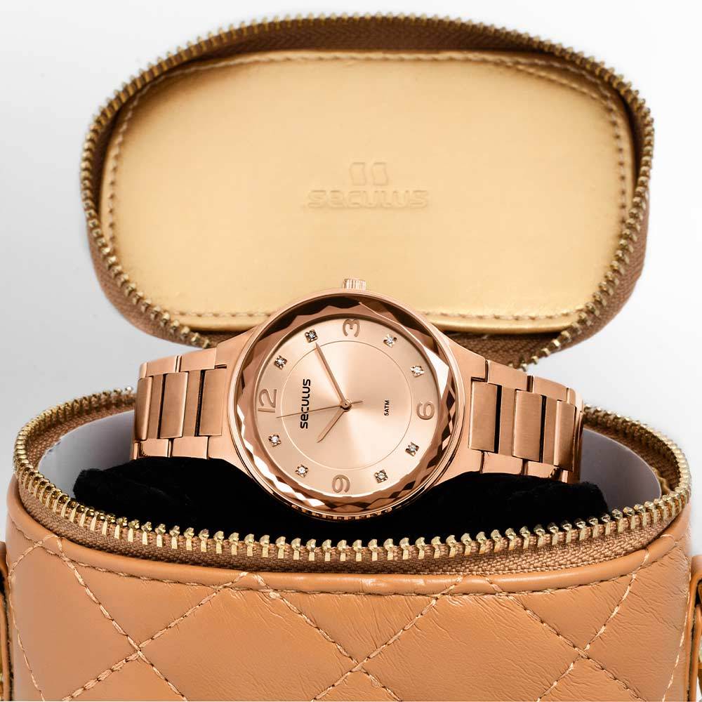 Compre o Kit Relógio Seculus Feminino Com Bolsa 77254LPSVRS2 na Eclock, a maior loja de relógios do Brasil! Vamos conhecer um pouco mais sobre o produto? Possui mecanismo Analógico, a pulseira é na cor Rosê, fabricada em Aço, com 25 cm de comprimento, 1,7 cm de Largura e possui Fecho Dobrável com Dois Botões. O Relógio pesa aprox. 100 g. A Caixa (peça onde fica o mostrador) é fabricada em Aço, possui fundo do tipo Rosqueado, mede 4,0 cm de diâmetro, sem considerar a coroa, e 1,0 cm de espessura, o que é considerado tamanho Grande para relógios do gênero Feminino. O Kit Relógio Seculus Feminino Com Bolsa 77254LPSVRS2 tem nível de resistência à água especificado em 5 ATM. Com relação as funções adicionais do relógio: possui Não tem Calendário, Não Possui Cronômetro, Não Possui Alarme, Não Possui Timer, Não possui função de Aviso de Hora Cheia (Função Chime), Não Possui Iluminação Noturna. É Fabricado por Seculus da Amazônia Indústria e Comércio SA. CNPJ: 34.516.088/0001-10 e tem Garantia de 2 Anos com o Fornecedor.