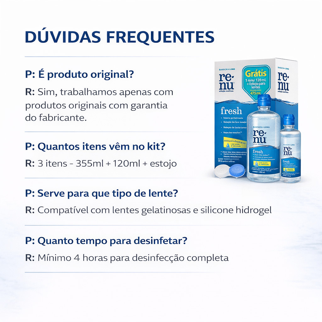Descrição O Kit Renu Fresh 355ml + 120ml + Estojo para Lentes é a solução prática e eficaz para quem utiliza lentes de contato diariamente. Desenvolvida pela Bausch + Lomb, a fórmula do Renu Fresh proporciona limpeza, desinfecção, hidratação e remoção de proteínas, mantendo as lentes confortáveis e seguras para o uso prolongado. Detalhes do Produto O kit oferece praticidade e economia, contendo: 1 frasco de 355ml, ideal para o uso diário em casa; 1 frasco de 120ml, perfeito para viagens e transporte; 1 estojo para lentes, garantindo maior higiene e segurança no armazenamento. Com uma formulação suave, o Renu Fresh proporciona sensação de frescor nos olhos, reduz irritações e garante visão clara durante todo o dia. Diferenciais e Benefícios Solução multiuso 4 em 1: limpa, desinfeta, hidrata e remove proteínas Kit completo com frasco grande, frasco pequeno e estojo Mantém as lentes hidratadas e confortáveis por mais tempo Compatível com lentes gelatinosas e silicone hidrogel Frasco de 120ml ideal para viagens Perguntas Frequentes (FAQ) 1. Esse kit é indicado para qualquer tipo de lente? Sim, ele é indicado para lentes de contato gelatinosas e de silicone hidrogel. 2. Posso usar apenas o frasco de 120ml em viagens? Sim, ele é prático e segue os padrões permitidos para bagagem de mão em voos. 3. Preciso esfregar as lentes ao usar a solução? Sim, recomenda-se esfregar suavemente as lentes para garantir limpeza completa antes de armazená-las. Modo de Uso Lave bem as mãos antes de manusear as lentes. Coloque a lente na palma da mão, aplique a solução e esfregue suavemente. Enxágue e armazene no estojo com solução fresca. Deixe as lentes imersas por no mínimo 4 horas antes do uso. Composição A fórmula contém agentes de limpeza, desinfecção e hidratação, como ácido bórico, edetato dissódico, poloxamina e conservantes específicos. Verifique o rótulo do produto para detalhes completos da composição. Resumo O que é? Kit de solução multiuso para lentes de contato Quem deve usar? Usuários de lentes gelatinosas ou silicone hidrogel Quando usar? Uso diário para limpeza, desinfecção e armazenamento Onde usar? Na higienização e conservação das lentes Por que usar? Mantém as lentes limpas, hidratadas e confortáveis Como aplicar? Esfregar, enxaguar e armazenar com solução fresca por no mínimo 4h