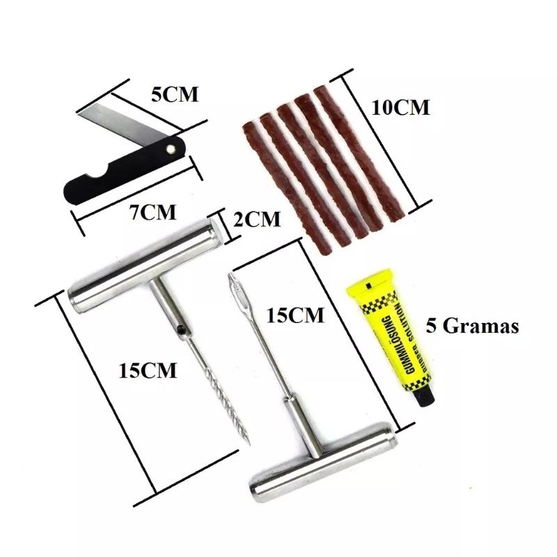 "SEJA MUITO BEM VINDO A NOSSA LOJA" TEMOS O PRODUTO A PRONTA ENTREGA, ENVIAMOS EM 24 HORAS ÚTEIS APÓS CONFIRMAÇÃO DE PAGAMENTO. KIT MALETA REPARO DE PNEU CARRO E MOTO FÁCIL E PRÁTICO DE USAR, ESTE KIT VAI TE AJUDAR NA HORA DA EMERGÊNCIA A VOCÊ MESMO FAZER O REPARO DE SEU VEÍCULO. INSTRUÇÕES DE USO: 1- UTILIZE O ESCAREADOR PARA PREPARAR O LOCAL DANIFICADO ANTES DE RECEBER O PREPARO 2- COLOQUE O REPARO NO APLICADOR 3- INTRODUZA O APLICADOR NO FURO DO PNEU 4- EMPURRE O APLICADOR ATÉ ENCOSTAR PRÓXIMO AO CABO 5- RETIRE O APLICADOR E RECORTE A SOBRA DO REPARO E MANTENHA APROXIMADAMENTE 5mm DE SOBRA DO REPARO DO PNEU. IMPORTANTE: UTILIZAR EM PNEU SEM CÂMARA CONTEÚDO DA EMBALAGEM: 1 ESCAREADOR 2 APLICADOR DE REPAROS 1 TUBO DE COLA 1 ESTILETE 1 CHAVE ALEN 15 REMENDOS
