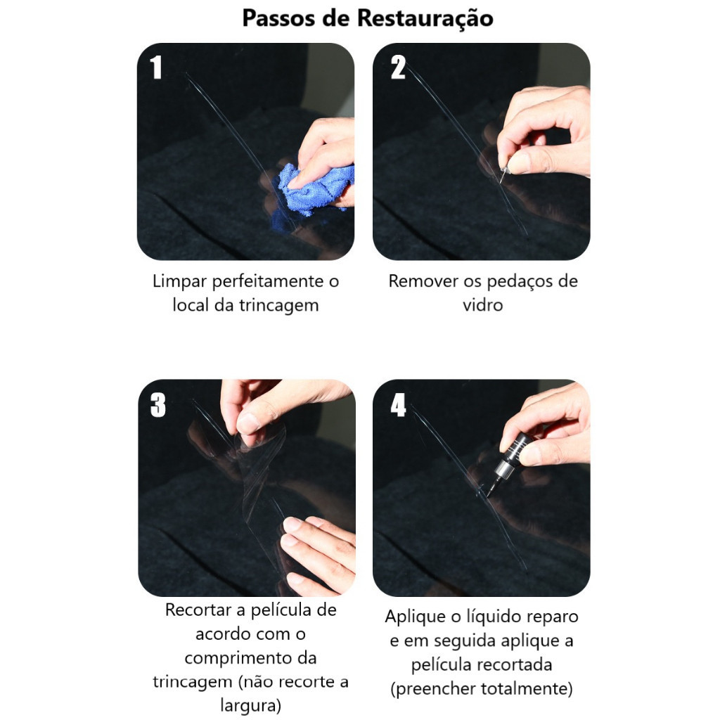 Bem vindos a loja Carpei Acessórios! ***ATENÇÃO** SIGA O PASSO A PASSO ILUSTRADO NAS FOTOS DA CAPA PARA O REPARO! NÃO NOS RESPONSABILIZAMOS COM O MAU USO DO PRODUTO ***OBS*** A DIFERENÇA ENTRE AS CORES ESTÁ APENAS NA EMBALAGEM E NÃO NO CONTEÚDO O produto cria uma camada invisível que preenche o trincado e repara o dano entrando na cavidade de ar criada no trinco ou fissura restaurando parte da visibilidade anterior. O produto é uma especie de vidro liquido para reparos. CARACTERÍSTICA: - COR: Preto e Branco Kit contem: 1x resina de reparo - tubinho com 3ml 5x filme de finalização 1x lâmina de acabamento NÃO ACOMPANHA O APLICADOR COM VENTOSA PARA PRESIONAR A RESINA NA TRINCA, AQUI NESSE PRODUTO SOMENTE OS ITENS RELACIONADOS ACIMA, SOMENTE A RESINA PARA PEQUENAS TRINCAS QUE NÃO NECESSITA DO PRESSIONADOR. INSTRUÇÕES PARA REPARO RECOMENDAMOS APLICAR O REPARO SOB A VIGILÂNCIA DE UM TÉCNICO ESPECIALIZADO 1 - Assim que ocorrerem danos, cubra a área com fita transparente para impedir que umidade e sujeira entrem na área danificada. 2 - O dano deve ser reparado o mais rápido possível para evitar que pequenas rachaduras se espalhem. 3 - Não faça reparos sob luz solar direta. 4 - A temperatura ideal de aplicação é de 15 ° C a 32 ° C. Espere que o veículo se adapte a essa temperatura se estiver em um ambiente quente ou frio. 5 - As superfícies devem estar limpas e secas para fazer um reparo adequado. 6 - Não permita que a resina entre em contato com o acabamento pintado do carro, as palhetas do limpador ou os acabamentos plásticos, pois isso pode causar danos. Nem todos os danos podem ser reparados para restaurar a clareza óptica total. 7 - O kit corrige 1 fenda ou chip de mosca 8 - Tempo de cura (tempo necessário para o enchimento atingir o conjunto completo): 30 minutos no mínimo 9 - Após o enchimento do trinco, colocar o veículo ao sol por 20 min para a secagem do produto; Obs 1: O produto tem que ser utilizado para efetuar o reparo em dia ensolarado, pois só terá sua eficácia devido a luz solar que ajuda na cura do produto. Se o reparo for feito em garagem coberta ou em dias de chuva não irá dar certo. Obs 2: Para reduzir o risco de contato químico com a pele e os olhos, sempre use óculos e luvas de segurança ao manusear este produto. **Sobre nós:** Trabalhamos com produtos de qualidade e com custo benefício, e prezamos pelo atendimento de qualidade. Antes de comprar, certifique-se que seus dados estão atualizados e corretos Nossos produtos são todos a pronta entrega, com garantia, envio rápido e segurança, os produtos são bem embalados e protegidos por saco bolha. Leia todo o anuncio, qualquer dúvida fique à vontade para nos perguntar antes de clicar em comprar. Estamos à sua disposição! Após a compra não esqueça de confirmar o recebimento e nos qualificar! Seu feedback é muito importante para nós!