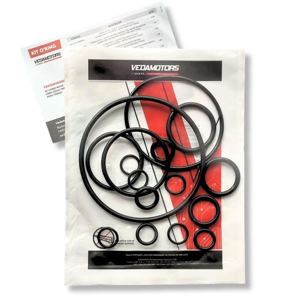 Evite vazamentos e garanta a vedação perfeita do seu motor — compre agora o Kit de Anéis O’Ring e mantenha sua moto sempre em ótimo desempenho! A importância do Kit de Anéis O’Ring está na vedação eficiente que ele proporciona nas conexões do motor e sistemas da moto. Esses anéis impedem vazamentos de óleo, combustível ou ar, mantendo a pressão ideal e o funcionamento correto das peças. Garante durabilidade, desempenho e economia, evitando danos e manutenção desnecessária. Borracha De Alta Resistência A Desgastes, Impactos, Óleo Mineral E Calor. Compatível com: HONDA CBX 250 TWISTER 2001 CBX 250 TWISTER 2002 CBX 250 TWISTER 2003 CBX 250 TWISTER 2004 CBX 250 TWISTER 2005 CBX 250 TWISTER 2006 CBX 250 TWISTER 2007 XR 250 TORNADO 2001 XR 250 TORNADO 2002 XR 250 TORNADO 2003 XR 250 TORNADO 2004 XR 250 TORNADO 2005 XR 250 TORNADO 2006 XR 250 TORNADO 2007 XR 250 TORNADO 2008 Conteúdo da Embalagem: 04 O´Ring da Guia de Válvula 10,00 X 1,50 01 O´Ring da Tampa Lateral Esquerda Diâmetro Menor 13,95 X 2,62 01 O´Ring da Tampa Lateral Esquerda Diâmetro Maior 30,00 X 2,50 01 O´Ring da Vareta do Óleo 18,00 X 3,00 01 O´Ring do Motor de Partida 24,50 X 3,00 01 O´Ring da Tampa do Filtro de Óleo 54,00 X 2,50 01 O´Ring da Tampa da Engrenagem de Partida 70,00 X 3,00 01 O´Ring do Tensor da Corrente de Comando 9,50 X 1,50 01 O´Ring da Admissão 36,17 X 2,62 02 O´Ring da Mangueira do Radiador Superior 9,50 X 2,00 02 O´Ring da Mangueira do Radiador Inferior 10,00 X 2,50 Características: - Produto desenvolvido com os mesmos parâmetros e encaixes do original, substituindo o mesmo sem nenhum problema ou adaptação. - Elaborado com matéria-prima de alta qualidade - Testado e aprovado dentro das normas de segurança., Importante: - Antes de comprar, verifique o modelo compatível a sua moto. - Para a instalação do produto corretamente, leve ao mecânico de sua confiança! - Não nos responsabilizamos pelo mau uso do produto