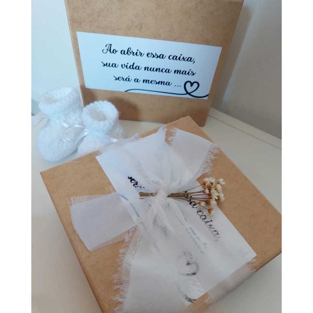 O kit Revelação de Gravidez Completo conta com uma caixa mdf crú 15x15x5cm com tampa adesivada frente e verso + 1 par de sapatinho de bebê em crochê feito a mão (par Branco ou Rosa e Azul) + 1 chaveiro monóculo personalizado + 1 foto impressa. O monóculo pode ser personalizado com a sua imagem OU pequena frase desejada. As informação para personalização do monóculo e a foto que deve ir impressa devem ser enviados pelo chat, imediatamente após a confirmação do pedido. Caso a informação não seja enviada em até 2h (após a confirmação do pedido), o kit será enviado com a frase padrão do monóculo "Promovido a Papai" e a foto padrão que consta na imagem do anuncio. OBS: O teste de gravidez não acompanha o kit, ele é apenas ilustrativo na imagem do anúncio. Estou à disposição via chat para esclarecer qualquer dúvida que você tenha <3