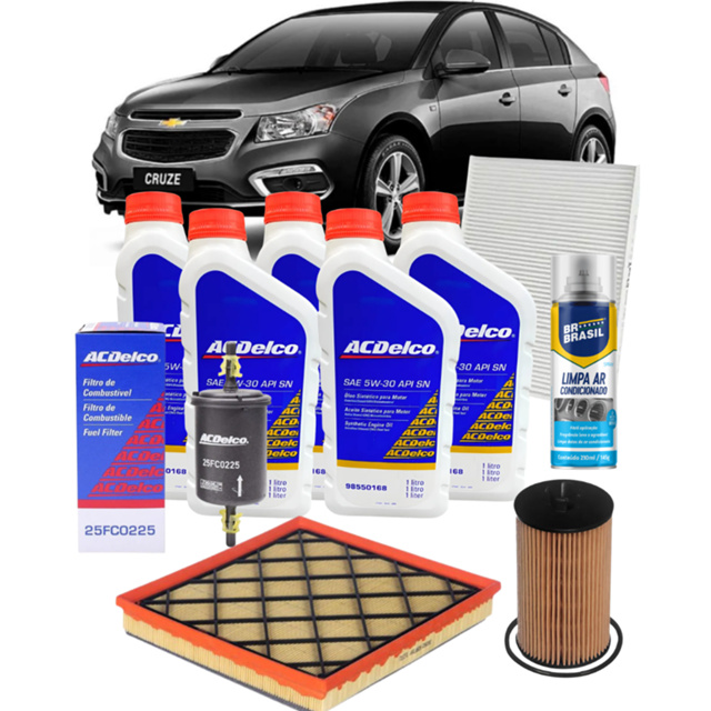 Conteúdo da embalagem: 05 Litros de Óleo 5w30 SN 100% Sintético GM ACDelco 98550168 01 Filtro de Óleo PEL674 TECFIL, WEGA, MAN ou MAHLE 01 Filtro de Combustível ACDelco 25F00225 01 Filtro de Ar ARL8828 TECFIL, MAN ou MAHLE 01 Filtro de Cabine ACP126 TECFIL 01 Higienizador Ar condicionado BR Brasil 01 Anel vedação Carter 01 Etiqueta controle de óleo ACDELCO **Acompanha etiqueta de marcar a próxima troca de óleo** **Produtos à pronta entrega ** Aplicação: CHEVROLET Cruze1.8 16V 144cv 2011 2012 2013 2014 2015 2016 (HB Sport / LT / LTZ) - automático / mecânicoFlex Power AutoStileMotors.