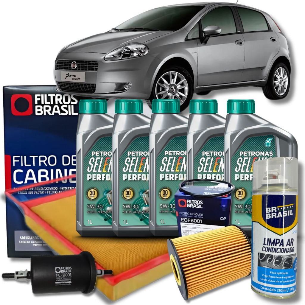 Descrição SUPER KIT TROCA DE OLEO + KIT IGIENIZACAO Fiat Leve Punto Flex - (Essence / HLX / Sporting) - Dualogic / mecânico 1.8 - 132 cv 2012 --> FIAT LINEA 2011 EM DIANTE 1.8 8 e 16V E-TORQ LINEA 1.8 8V Flex -álcool / Gasolina - Dualogic / Mecânico 370 A 0011 - E-Torq - 132 Cv 10 -- 11 COMPONENTES: 05-LT OLEO 5W30 SELENIA SINTETICO 01-FILTRO DE OLEO WEGA WOE912 01-FILTRO DE AR WEGA FAP9121 01-FILTRO DE COMBUSTIVEL WEGA FCI1660 01-FILTRO AR CONDICIONADO WEGA AKX1375 01-IGIENIENIZADOR AUTO SHINE CARRO NOVO OU LAVANDA 01-ETIQUETA