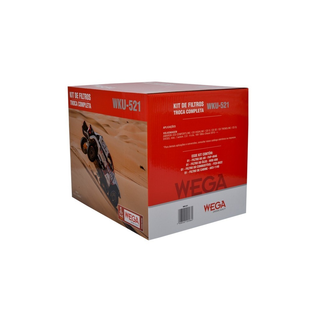Este anúncio contém 01 Kit de Revisão Troca Completa: 01 Filtro de Ar (FAP4046); 01 Filtro de Óleo (WOE680); 01 Filtro de Combustível (FCD0922); 01 Filtro de Cabine (Ar Condicionado) (AKX1140). Marca: Wega. Cód: WKU521. Acompanha Certificado de garantia e nota fiscal. Aplicação: Montadora: Volkswagen; Veículo: Amarok Cd Comfortline, Cd Highline, Cd S, Cd Se, Cd Trendline, Cs S; Motor: 2.0 4 Cilindros, 16V 180Cv Diesel - Manual / Automático; Ano: 2015, 2016, 2017, 2018, 2019, 2020, 2021, 2022, 2023, 2024. Por que trocar os filtros do veículo? Filtro de Motor e Combustível: Esses filtros são vitais para manter as impurezas longe do motor. Um filtro sujo pode causar falhas e reduzir a eficiência do carro. Dúvidas frequentes: - O Produto é novo? Sim. Nós trabalhamos apenas com produtos novos, e com garantia. - O Produto é original? Sim. Nós só trabalhamos com distribuidores homologados pelo fabricante. - Tem garantia? Sim. Todos nossos produtos têm 90 dias de garantia de fábrica contra defeitos de fabricação. - O produto é igual ao da foto? Sim. Todas as fotos são fieis ao que você receberá. - Em quanto tempo recebo minha compra? É muito simples, basta colocar seu CEP no calculador de frete do anúncio. - Como faço para saber se o produto deste anúncio se aplica ao meu veículo? Na descrição do anúncio você encontra todas as informações das aplicações corretas, se a informação que precisa não está na descrição do anúncio, deixe sua pergunta que nossa equipe de especialistas está preparada para solucionar qualquer dúvida. - Tem alguma dúvida sobre o produto ou sobre a compra? Deixe sua pergunta abaixo, que responderemos prontamente. Atendimento: Nosso horário de atendimento é: 24 horas Temos uma Equipe de Atendimento e Suporte Técnico à disposição. Após a compra, caso tenha alguma dúvida ou algum problema com o seu produto, entre em contato conosco utilizando os canais informados pelas mensagens de pós-venda ou pelo próprio chat de atendimento. • O cumprimento do prazo de entrega é de total responsabilidade da Transportadora e esse prazo é informado no momento da compra podendo ser alterado por condições logísticas. Importante: • Somos Loja Oficial Shopee; • Todos os nossos produtos são checados e bem embalados antes da expedição. • Recomendamos sempre que toda e qualquer instalação seja realizada por profissionais especializados para evitar problemas futuros, pois não somos responsáveis pela má instalação ou mau uso do produto. • Confira se os dados cadastrais estão atualizados, principalmente se o endereço de entrega está correto para evitar que o seu produto retorne e mantenha o número de contato atualizado para que possamos entrar em contato caso necessário. Quem somos: Somos uma empresa, localizada no Rio de Janeiro, com mais de 50 anos de mercado no segmento de atacado e distribuição de Auto Parts em geral. Hoje, a Rhino conta com mais de 10.000 produtos em seu portfólio nos segmentos de refrigeração automotiva, arrefecimento automotivo, suspensão automotiva, mecânica em geral, moto parts e acessórios automotivos. RHINO AUTOPARTS - O Maior E-commerce de Autopeças e Acessórios Automotivos do Brasil.